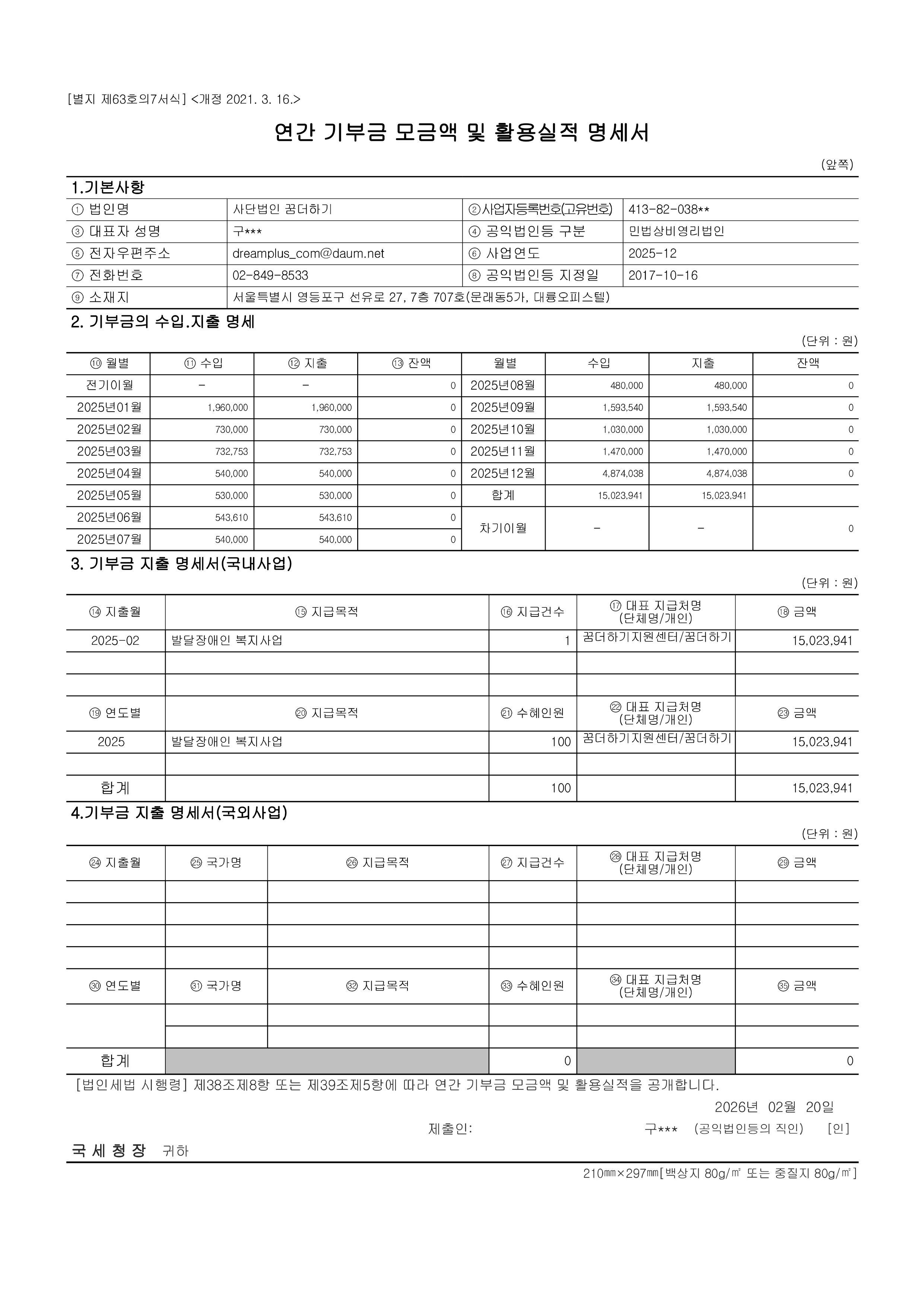 제목 2025년 기부금 모금액 및 활용실적 작성자 관리자 등록일 2026/02/27 19:16:54 조회수 23 연관 카테고리 파일1 : 사단법인 꿈더하기_2025 연간 기부금 모금액 및 활용실적 명세서_26.2.20_1.jpg 목록